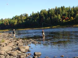 The fishing so far throughout September this year has been variable depending on what days you were on the river. Monday and Tuesday with the water rising over a foot after a rain on Sunday and Monday, we saw some good fishing. Kris Kimble of Norwich,Ct had 5 hookups while fishing through one pool, landing a fresh 18 lb Salmon among them - all on a # 6 Glitter Bear. By mid week we did most of our fishing on the Cains River and in the Upper Blackville area on the Miramichi, as it seemed that the rise in water at the begining of the week had moved most of the fish up river. With most of them having been in the river system for so long, most of our time was spent watching them jump and roll than actually landing them.